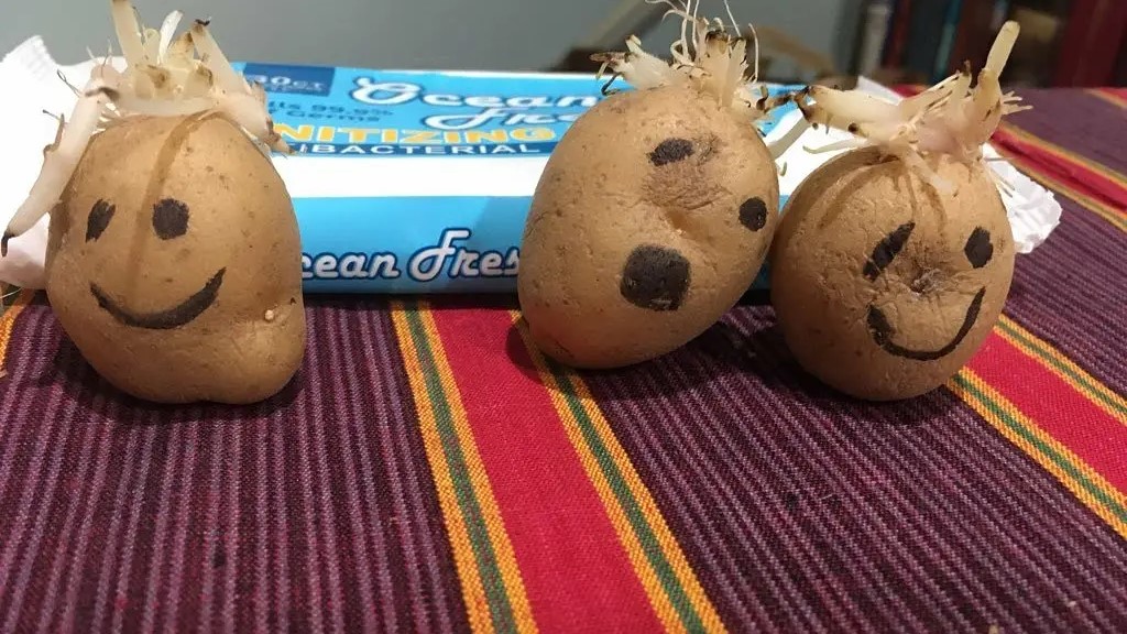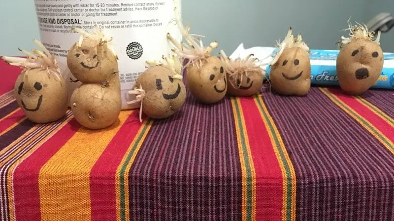 The potatoes have sprouted. But no! The potatoes have hair! someone exclaims.